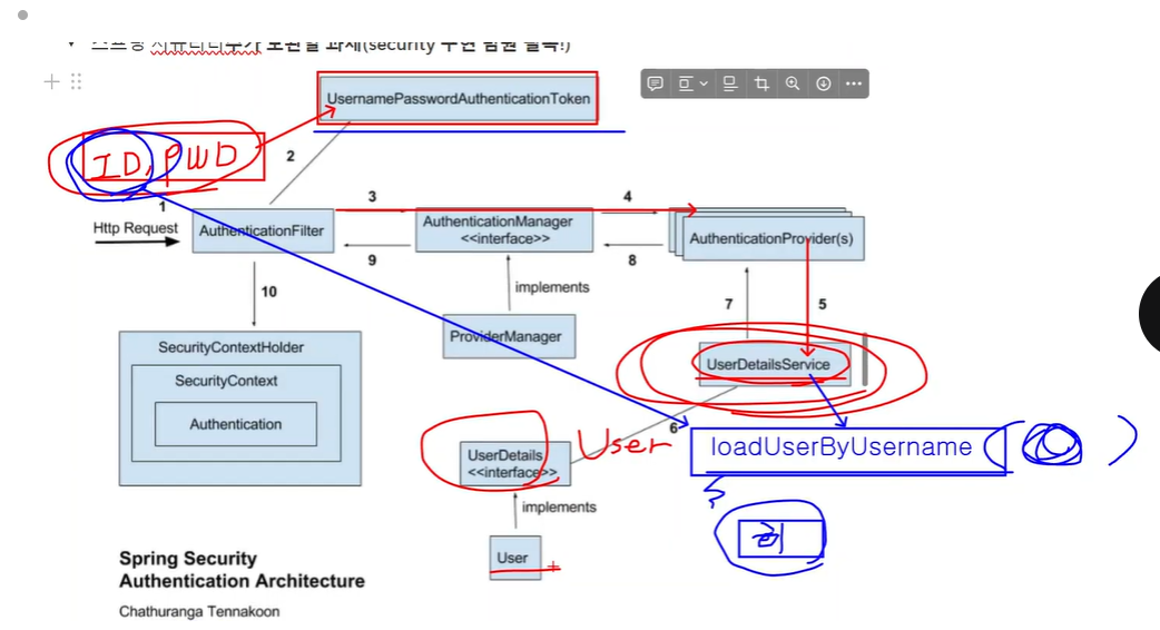 - loadUserByUsername에선 User details 타입의 user객체 반환