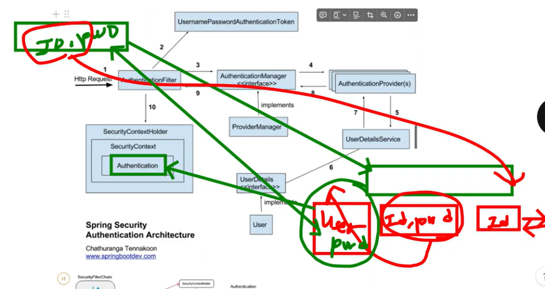 - loadUserByUsername 메소드에서 매개변수(pwd)를 받음 -> 자동 생성된다 함